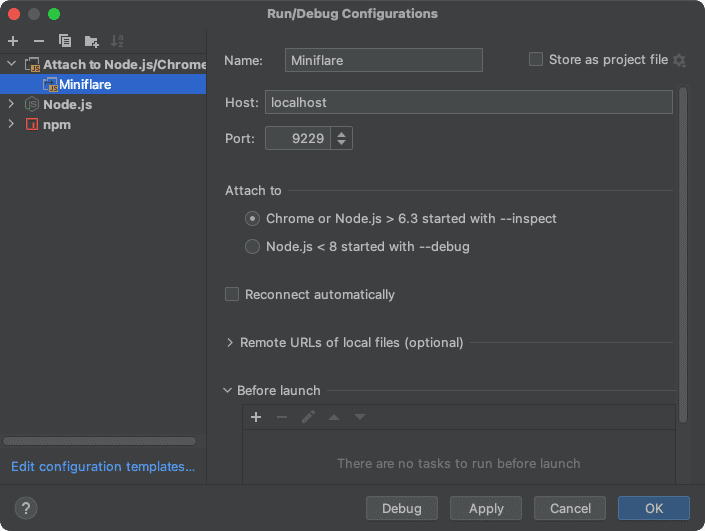.vscode/launch.json{ "configurations": [ { "name": "Miniflare", "type": "node", "request": "attach", "port": 9229, "cwd": "/", "resolveSourceMapLocations": null, "attachExistingChildren": false, "autoAttachChildProcesses": false, } ]}From the Run and Debug menu in the activity bar, select the Miniflare
